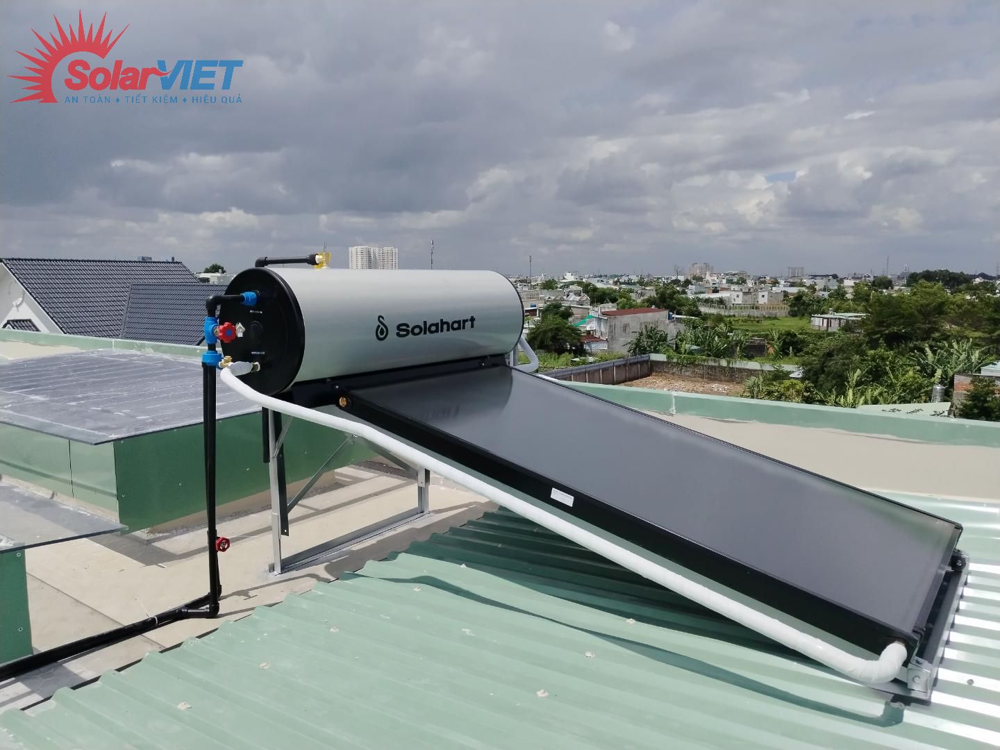 Diện tích mặt bằng không đủ để đón nắng tốt, Solahart 150 lit lắp đặt kết hợp kê lên tôn. Thiết kế nâng đuôi bồn đảm bảo trọng lượng máy không đè lên tôn nhiều.